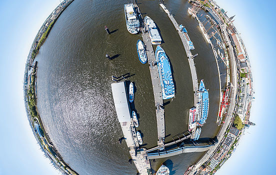 360° Kugelpanorama des Hamburger Hafens mit Elbphilharmonie aus der Luft geschossen